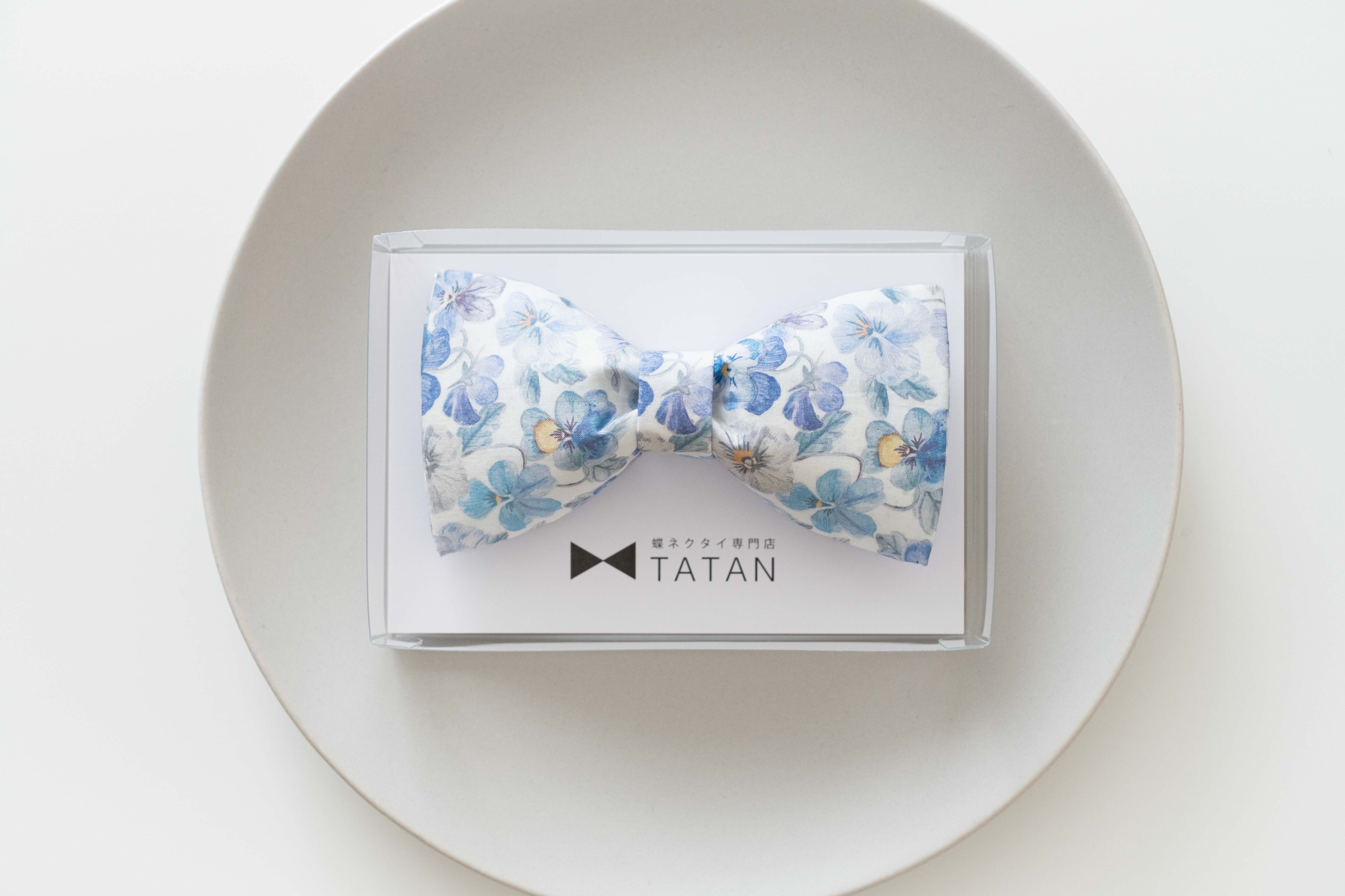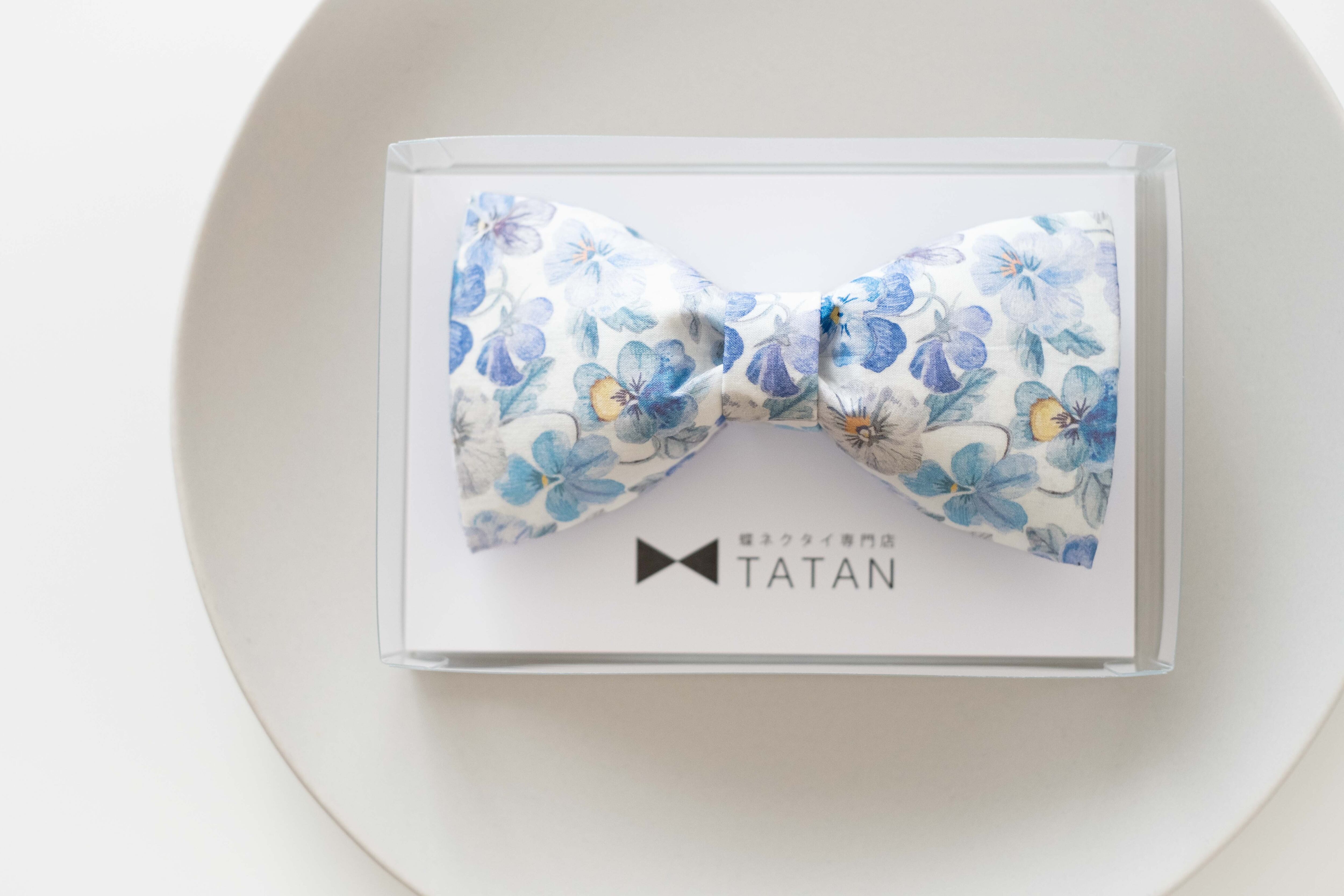 ブルーカラーのパンジーが連なったデザインの蝶ネクタイ。