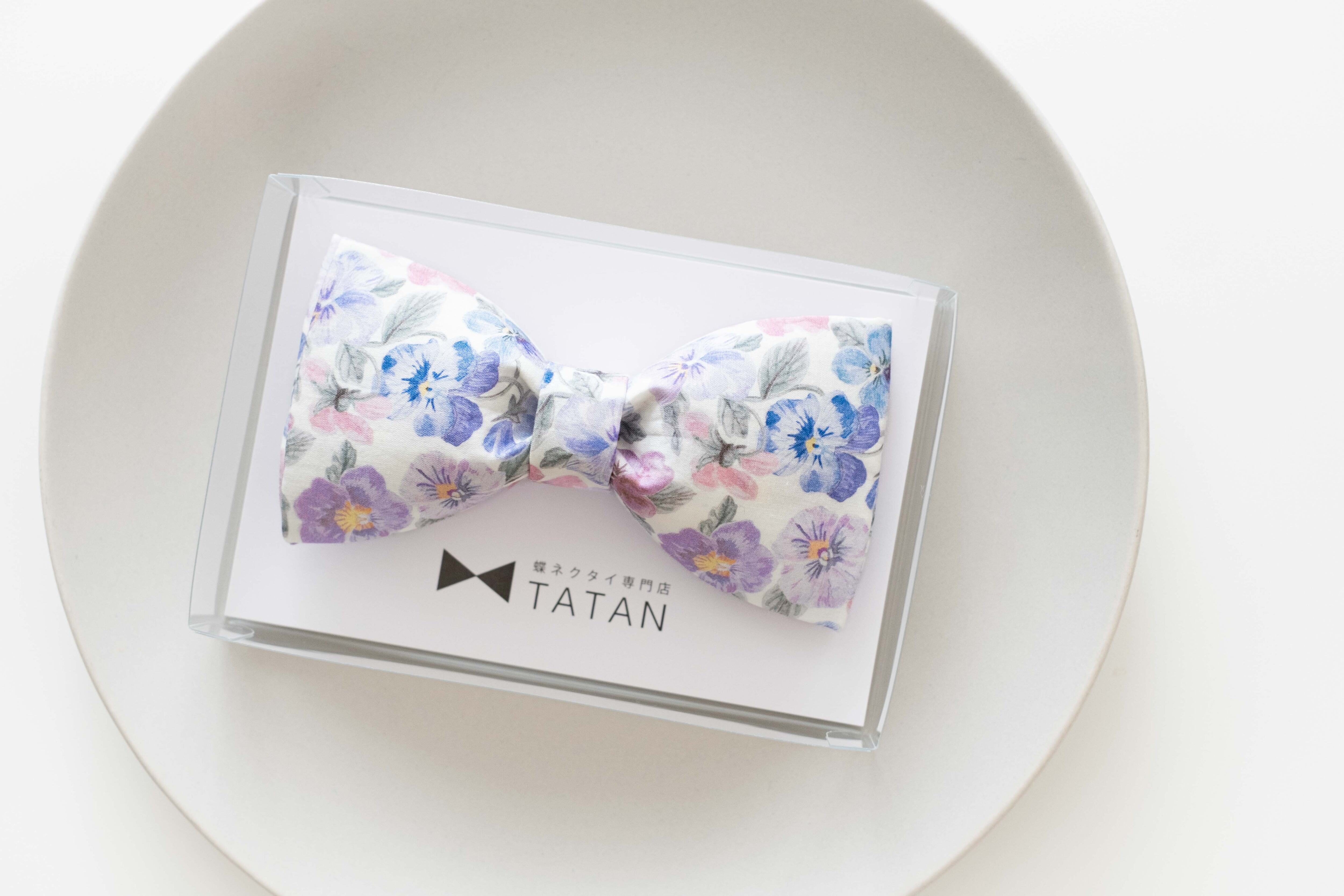 パープルカラーのパンジーが連なったデザインの蝶ネクタイ。